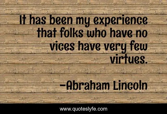 This page presents the quote "It has been my experience that folks who have no vices have very few virtues.". Author of this quote is Abraham Lincoln. This quote is about virtues, been, vices,.