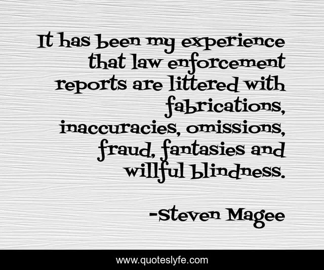 This page presents the quote "It has been my experience that law enforcement reports are littered with fabrications, inaccuracies, omissions, fraud, fantasies and willful blindness.". Author of this quote is Steven Magee. This quote is about enforcement, fraud, littered, reports, experience, inaccuracies, blindness, willful, omissions,.