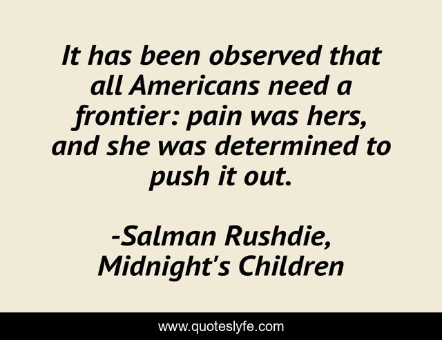 This page presents the quote "It has been observed that all Americans need a frontier: pain was hers, and she was determined to push it out.". Author of this quote is Salman Rushdie, Midnight's Children. This quote is about americans, endurance, murica, pain, frontier,.