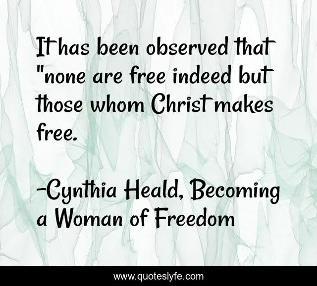 This page presents the quote "It has been observed that "none are free indeed but those whom Christ makes free.". Author of this quote is Cynthia Heald, Becoming a Woman of Freedom. .
