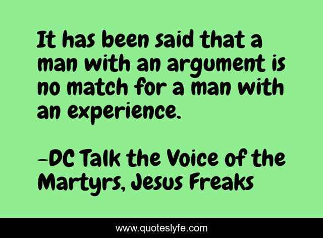 This page presents the quote "It has been said that a man with an argument is no match for a man with an experience.". Author of this quote is DC Talk the Voice of the Martyrs, Jesus Freaks. .