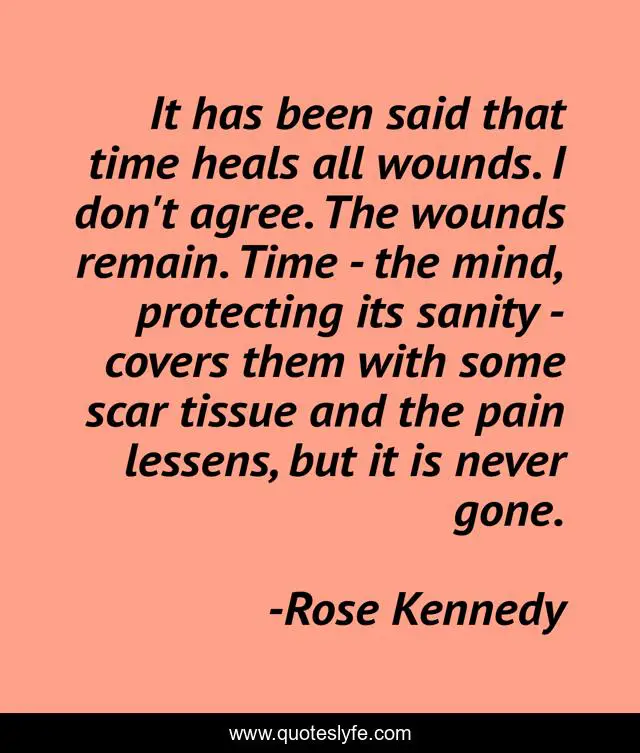 This page presents the quote "It has been said that time heals all wounds. I don't agree. The wounds remain. Time - the mind, protecting its sanity - covers them with some scar tissue and the pain lessens, but it is never gone.". Author of this quote is Rose Kennedy. This quote is about pain, said, mind,.
