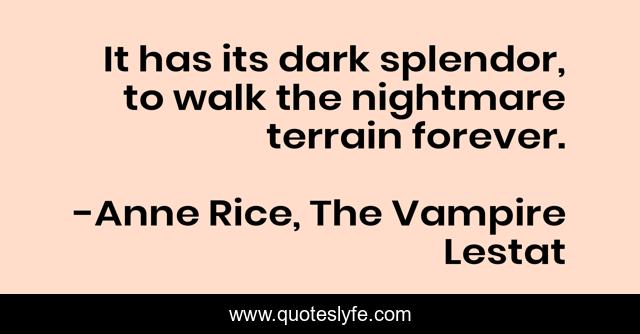 This page presents the quote "It has its dark splendor, to walk the nightmare terrain forever.". Author of this quote is Anne Rice, The Vampire Lestat. This quote is about anne-rice, quote, the-vampire-lestat, vampires, the-vampire-chronicles,.