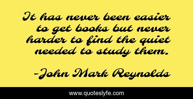 This page presents the quote "It has never been easier to get books but never harder to find the quiet needed to study them.". Author of this quote is John Mark Reynolds. This quote is about thinking, meditation, reading,.