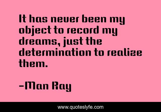 This page presents the quote "It has never been my object to record my dreams, just the determination to realize them.". Author of this quote is Man Ray. This quote is about determination, dreams,.