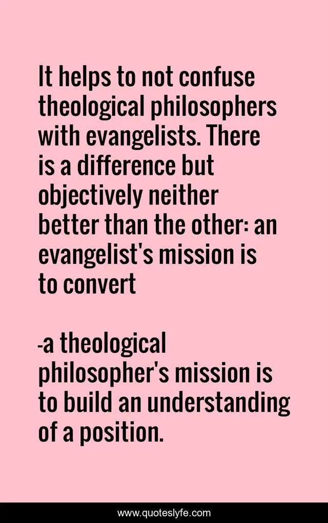 This page presents the quote "It helps to not confuse theological philosophers with evangelists. There is a difference but objectively neither better than the other: an evangelist's mission is to convert". Author of this quote is a theological philosopher's mission is to build an understanding of a position.. This quote is about criss jami, killosophy,.
