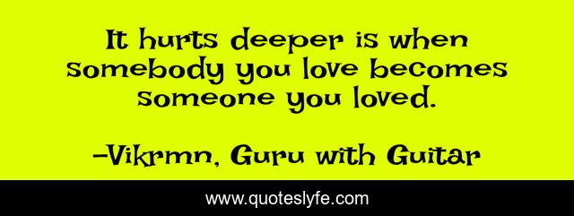 This page presents the quote "It hurts deeper is when somebody you love becomes someone you loved.". Author of this quote is Vikrmn, Guru with Guitar. This quote is about gwg, someone, vikram, guru-with-guitar, heart-break, motivational, confidence, ca-vikram-verma, hurt,.