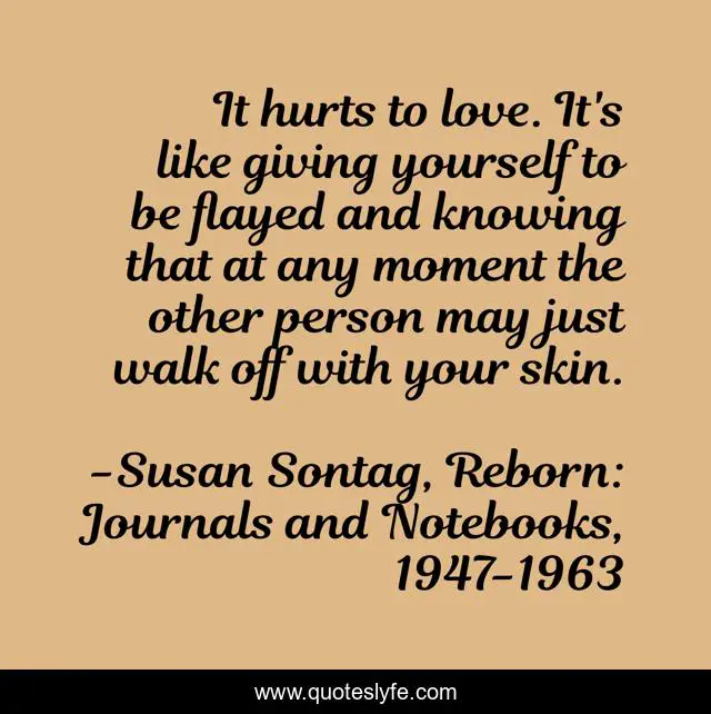This page presents the quote "It hurts to love. It's like giving yourself to be flayed and knowing that at any moment the other person may just walk off with your skin.". Author of this quote is Susan Sontag, Reborn: Journals and Notebooks, 1947-1963. This quote is about heartbreak, love, affection, love-hurts,.
