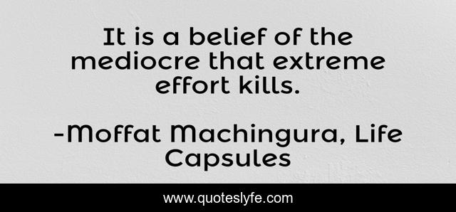 This page presents the quote "It is a belief of the mediocre that extreme effort kills.". Author of this quote is Moffat Machingura, Life Capsules. This quote is about mediocrity, beliefs, belief, hard-work, diligence,.
