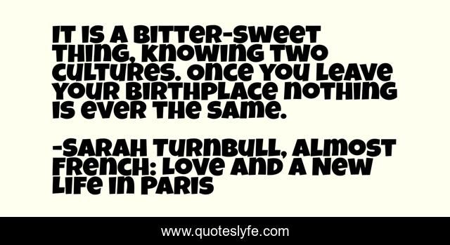 This page presents the quote "It is a bitter-sweet thing, knowing two cultures. Once you leave your birthplace nothing is ever the same.". Author of this quote is Sarah Turnbull, Almost French: Love and a New Life in Paris. This quote is about expatriate, travel,.