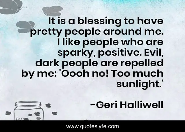 This page presents the quote "It is a blessing to have pretty people around me. I like people who are sparky, positive. Evil, dark people are repelled by me: 'Oooh no! Too much sunlight.'". Author of this quote is Geri Halliwell. This quote is about me, dark, evil,.