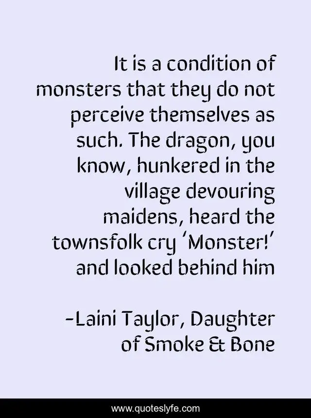This page presents the quote "It is a condition of monsters that they do not perceive themselves as such. The dragon, you know, hunkered in the village devouring maidens, heard the townsfolk cry ‘Monster!’ and looked behind him". Author of this quote is Laini Taylor, Daughter of Smoke & Bone. This quote is about akiva, daughter-of-smoke-and-bone, monsters,.