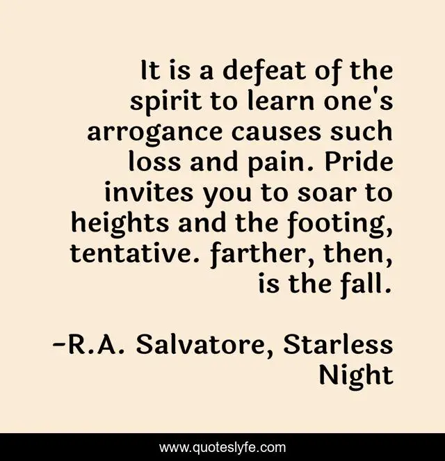 This page presents the quote "It is a defeat of the spirit to learn one's arrogance causes such loss and pain. Pride invites you to soar to heights and the footing, tentative. farther, then, is the fall.". Author of this quote is R.A. Salvatore, Starless Night. This quote is about loss, pride,.