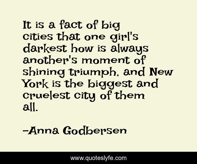 This page presents the quote "It is a fact of big cities that one girl's darkest how is always another's moment of shining triumph, and New York is the biggest and cruelest city of them all.". Author of this quote is Anna Godbersen. This quote is about darkest-hour, new-york-city,.