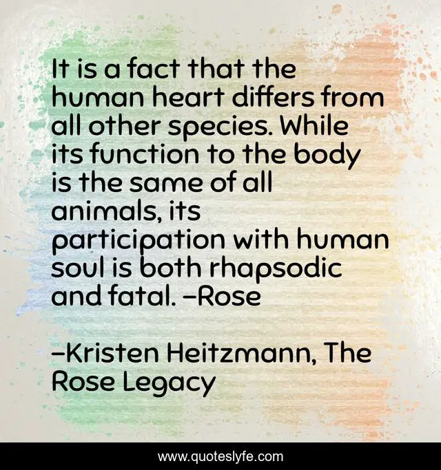 This page presents the quote "It is a fact that the human heart differs from all other species. While its function to the body is the same of all animals, its participation with human soul is both rhapsodic and fatal. -Rose". Author of this quote is Kristen Heitzmann, The Rose Legacy. This quote is about heart, human-heart, soul, rose,.