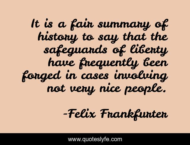 This page presents the quote "It is a fair summary of history to say that the safeguards of liberty have frequently been forged in cases involving not very nice people.". Author of this quote is Felix Frankfurter. This quote is about liberty, human, rights,.