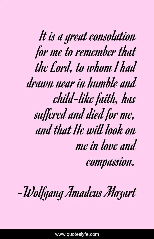 This page presents the quote "It is a great consolation for me to remember that the Lord, to whom I had drawn near in humble and child-like faith, has suffered and died for me, and that He will look on me in love and compassion.". Author of this quote is Wolfgang Amadeus Mozart. This quote is about compassion, faith, love, affection,.