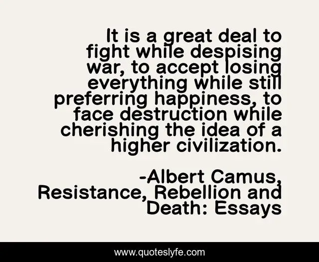 This page presents the quote "It is a great deal to fight while despising war, to accept losing everything while still preferring happiness, to face destruction while cherishing the idea of a higher civilization.". Author of this quote is Albert Camus, Resistance, Rebellion and Death: Essays. This quote is about albert-camus, letters-to-a-german-friend, war,.