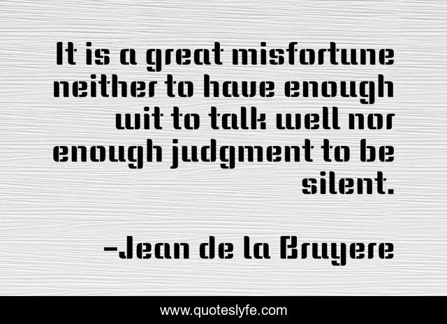 This page presents the quote "It is a great misfortune neither to have enough wit to talk well nor enough judgment to be silent.". Author of this quote is Jean de la Bruyere. .