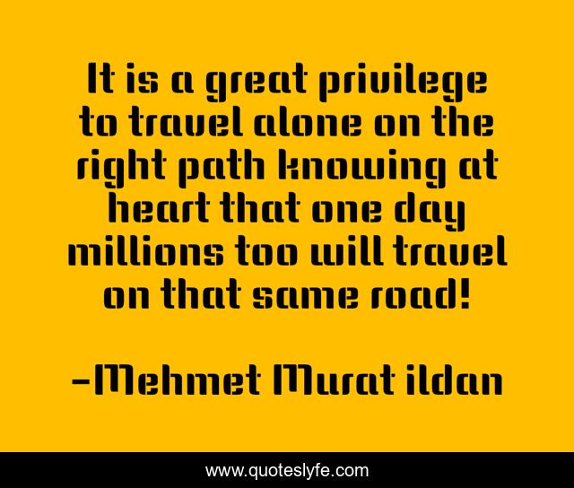 This page presents the quote "It is a great privilege to travel alone on the right path knowing at heart that one day millions too will travel on that same road!". Author of this quote is Mehmet Murat ildan. This quote is about right-path, paths, at-heart, mehmet-murat-ildan, ildan-wise-sayings, turkish, ildan-wisdom, turkish-playwrights, right-paths,.
