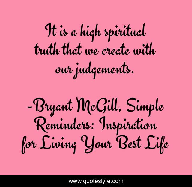 This page presents the quote "It is a high spiritual truth that we create with our judgements.". Author of this quote is Bryant McGill, Simple Reminders: Inspiration for Living Your Best Life. This quote is about judgement, spirituality, creativity, highness, truth,.