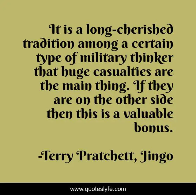 This page presents the quote "It is a long-cherished tradition among a certain type of military thinker that huge casualties are the main thing. If they are on the other side then this is a valuable bonus.". Author of this quote is Terry Pratchett, Jingo. This quote is about tactics, strategy, battle, military, casualties, war,.