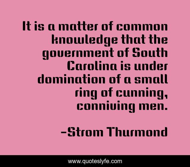 This page presents the quote "It is a matter of common knowledge that the government of South Carolina is under domination of a small ring of cunning, conniving men.". Author of this quote is Strom Thurmond. This quote is about small, men, government,.