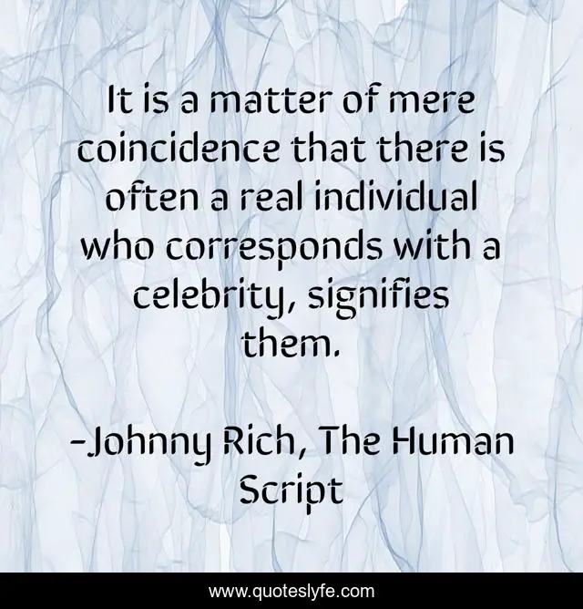 This page presents the quote "It is a matter of mere coincidence that there is often a real individual who corresponds with a celebrity, signifies them.". Author of this quote is Johnny Rich, The Human Script. This quote is about signify, celebrity, reality, celeb, signification, fame,.