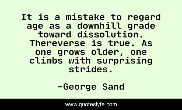 This page presents the quote "It is a mistake to regard age as a downhill grade toward dissolution. Thereverse is true. As one grows older, one climbs with surprising strides.". Author of this quote is George Sand. .