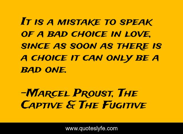This page presents the quote "It is a mistake to speak of a bad choice in love, since as soon as there is a choice it can only be a bad one.". Author of this quote is Marcel Proust, The Captive & The Fugitive. This quote is about love, affection, choices,.