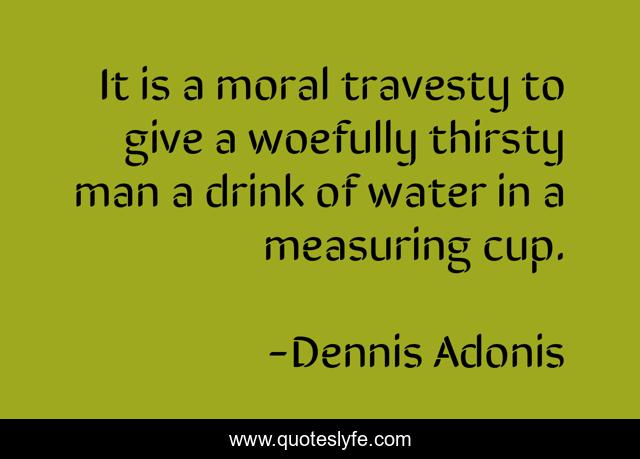 This page presents the quote "It is a moral travesty to give a woefully thirsty man a drink of water in a measuring cup.". Author of this quote is Dennis Adonis. This quote is about give-freely, share, wisdom,.