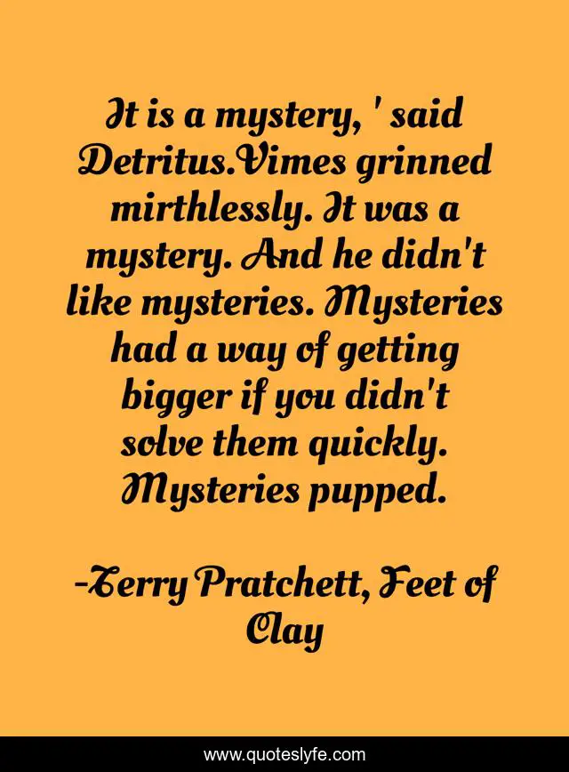 It is a mystery, ' said Detritus.Vimes grinned mirthlessly. It was a mystery. And he didn't like mysteries. Mysteries had a way of getting bigger if you didn't solve them quickly. Mysteries pupped.