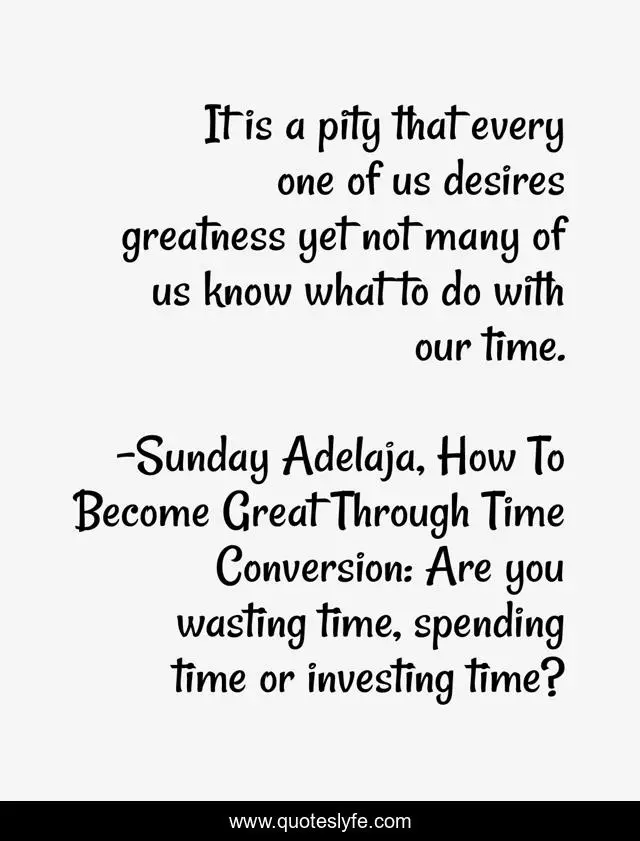 This page presents the quote "It is a pity that every one of us desires greatness yet not many of us know what to do with our time.". Author of this quote is Sunday Adelaja, How To Become Great Through Time Conversion: Are you wasting time, spending time or investing time?. This quote is about wealth, convert, productivity, desires, gift, work, life, great, value,.
