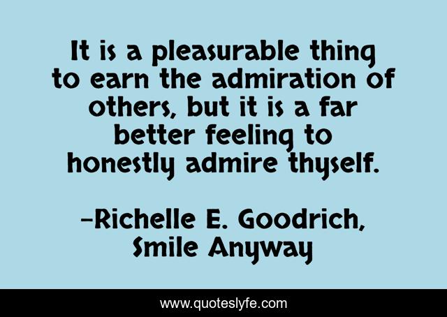 This page presents the quote "It is a pleasurable thing to earn the admiration of others, but it is a far better feeling to honestly admire thyself.". Author of this quote is Richelle E. Goodrich, Smile Anyway. This quote is about admiration, self-respect, admire, richelle, self-regard, richelle-goodrich, self-esteem, thyself, worth,.