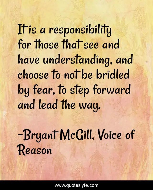 This page presents the quote "It is a responsibility for those that see and have understanding, and choose to not be bridled by fear, to step forward and lead the way.". Author of this quote is Bryant McGill, Voice of Reason. This quote is about fear, brave, responsibility, believer,.