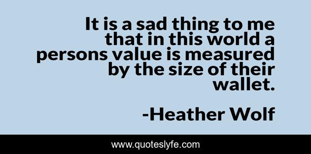 This page presents the quote "It is a sad thing to me that in this world a persons value is measured by the size of their wallet.". Author of this quote is Heather Wolf. This quote is about values-and-principles, heather-wolf, quotes-to-make-you-think, kipnuk-adventure-series, values-in-life, values,.