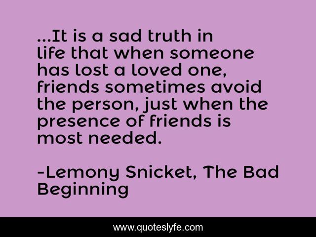 This page presents the quote "...It is a sad truth in life that when someone has lost a loved one, friends sometimes avoid the person, just when the presence of friends is most needed.". Author of this quote is Lemony Snicket, The Bad Beginning. This quote is about grief, death, friends,.