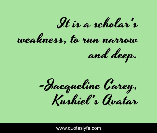 This page presents the quote "It is a scholar's weakness, to run narrow and deep.". Author of this quote is Jacqueline Carey, Kushiel's Avatar. This quote is about weakness, study, scholar, wisdom,.