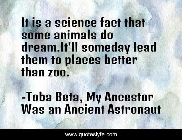 This page presents the quote "It is a science fact that some animals do dream.It'll someday lead them to places better than zoo.". Author of this quote is Toba Beta, My Ancestor Was an Ancient Astronaut. This quote is about races, dream, civilization, sign,.