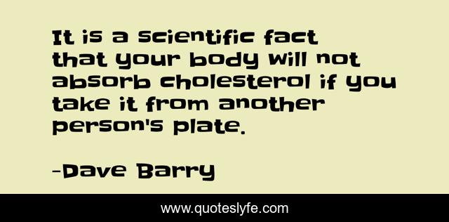 This page presents the quote "It is a scientific fact that your body will not absorb cholesterol if you take it from another person's plate.". Author of this quote is Dave Barry. This quote is about body, person,.