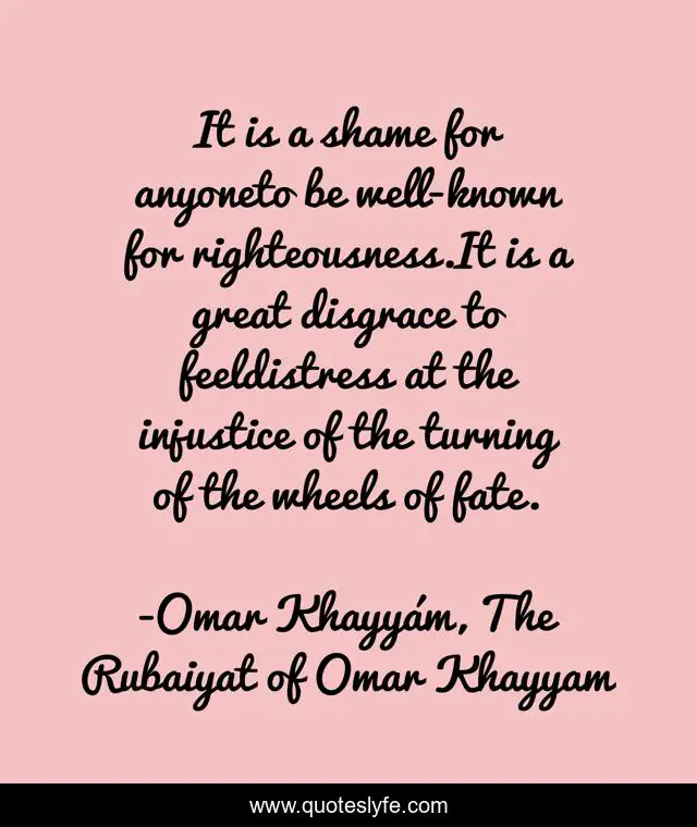 This page presents the quote "It is a shame for anyoneto be well-known for righteousness.It is a great disgrace to feeldistress at the injustice of the turning of the wheels of fate.". Author of this quote is Omar Khayyám, The Rubaiyat of Omar Khayyam. This quote is about righteousness, injustice, fate,.