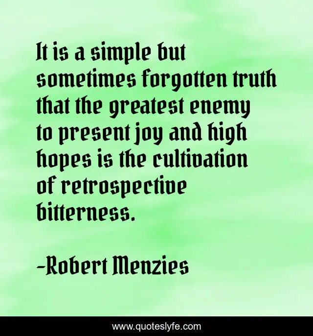 This page presents the quote "It is a simple but sometimes forgotten truth that the greatest enemy to present joy and high hopes is the cultivation of retrospective bitterness.". Author of this quote is Robert Menzies. This quote is about anger, bitterness, retrospective, revenge,.