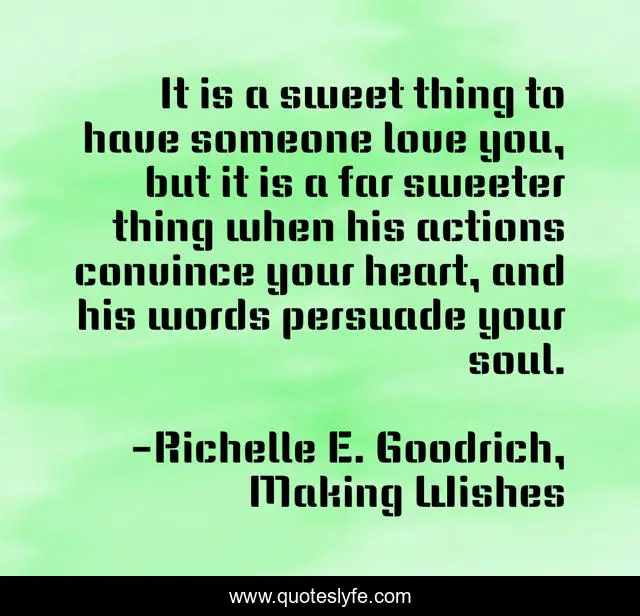 This page presents the quote "It is a sweet thing to have someone love you, but it is a far sweeter thing when his actions convince your heart, and his words persuade your soul.". Author of this quote is Richelle E. Goodrich, Making Wishes. This quote is about heart, love, richelle-e-goodrich, soul, richelle, husband, love-story, richelle-goodrich, affection,.