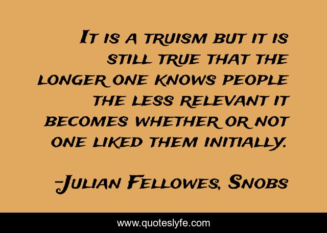 This page presents the quote "It is a truism but it is still true that the longer one knows people the less relevant it becomes whether or not one liked them initially.". Author of this quote is Julian Fellowes, Snobs. This quote is about friends, friendship,.