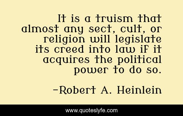 This page presents the quote "It is a truism that almost any sect, cult, or religion will legislate its creed into law if it acquires the political power to do so.". Author of this quote is Robert A. Heinlein. This quote is about law, political, power,.