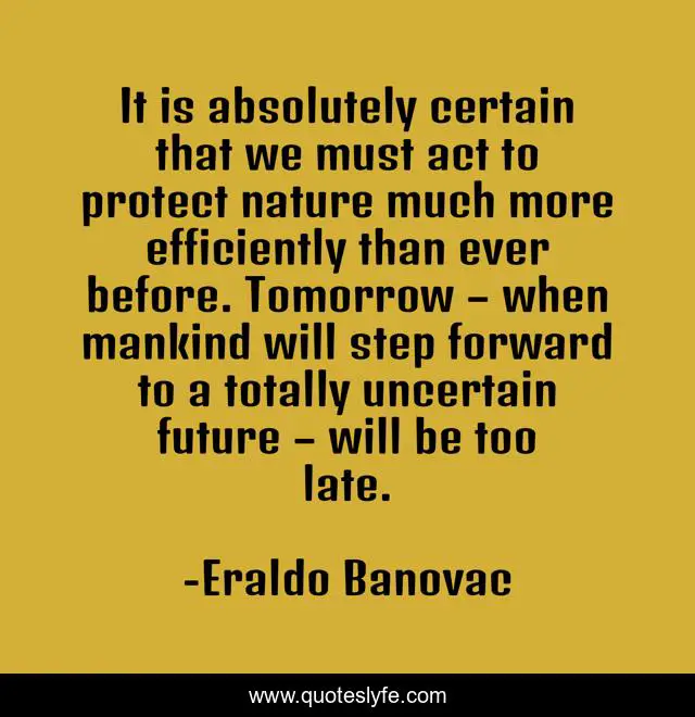 This page presents the quote "It is absolutely certain that we must act to protect nature much more efficiently than ever before. Tomorrow – when mankind will step forward to a totally uncertain future – will be too late.". Author of this quote is Eraldo Banovac. This quote is about environment, future, environmental-protection, nature,.