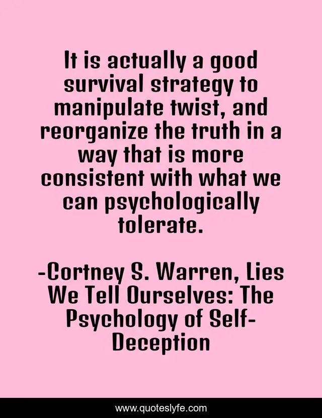This page presents the quote "It is actually a good survival strategy to manipulate twist, and reorganize the truth in a way that is more consistent with what we can psychologically tolerate.". Author of this quote is Cortney S. Warren, Lies We Tell Ourselves: The Psychology of Self-Deception. This quote is about survival, psychologically, consistent, tolerate, strategy, twist, truth, reorganize, manipulate,.