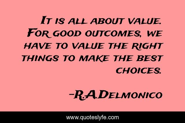 This page presents the quote "It is all about value. For good outcomes, we have to value the right things to make the best choices.". Author of this quote is R.A.Delmonico. .