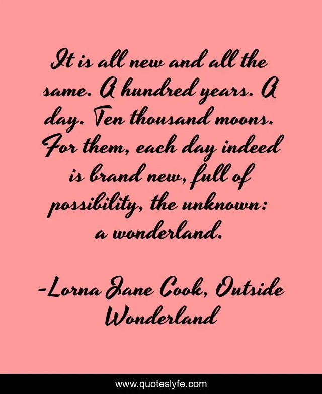 This page presents the quote "It is all new and all the same. A hundred years. A day. Ten thousand moons. For them, each day indeed is brand new, full of possibility, the unknown: a wonderland.". Author of this quote is Lorna Jane Cook, Outside Wonderland. This quote is about wonderland, possibility,.