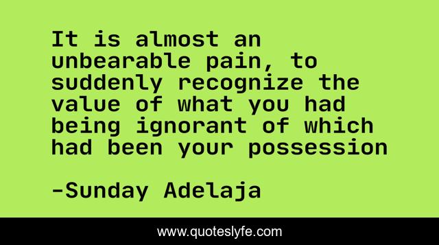 This page presents the quote "It is almost an unbearable pain, to suddenly recognize the value of what you had being ignorant of which had been your possession". Author of this quote is Sunday Adelaja. This quote is about possession, unbearable, pain, almost, recognize, had, it, been, suddenly,.